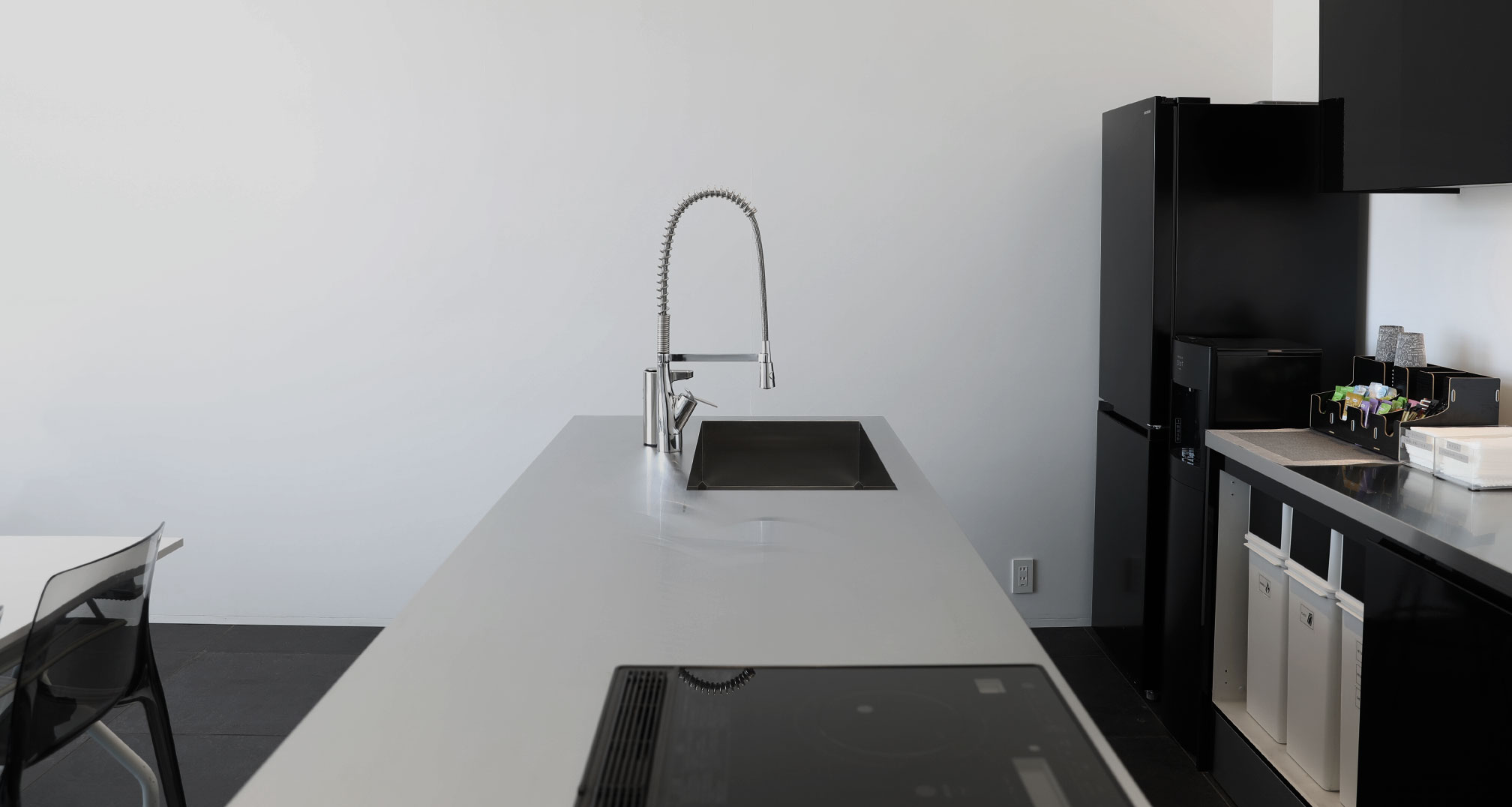 높은 천장과 그레이 컬러로 럭셔리한 자유공간입니다. 5층 높이에서 들어오는 자연광이 특별한 전망을 선사합니다. 발코니는 실내와 출입도 원활. 상설의 의자에 앉아, 시선과 기분을 바꾸어 편히 쉬실 수 있습니다.